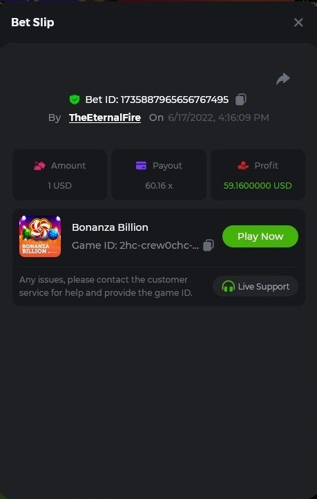 1. X83: Bet ID: 129193616991060246 https://bc.game/#/sd/116KJZBU600TUB ----- X130: Bet ID: 129444142433436075 https://bc.game/#/sd/116NAN0FM7WIS3 ---- X58: BET ID: 129619304084669553 https://bc.game/#/sd/116P9N5XJH32TV ---- X420 Bet ID: 129619304084671976 https://bc.game/#/sd/116PHFI0T492QB