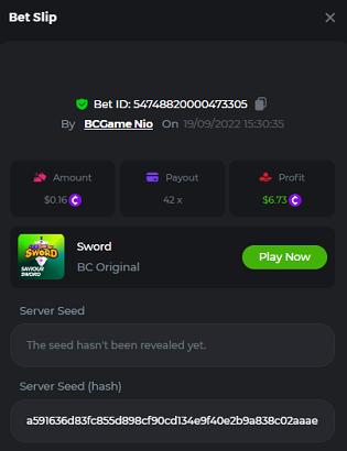 $2.5k Prestige Savior Sword Challenge #47 Starts: 19, September 7:30pm GMT Ends: 26, September 7:30pm GMT Ladies and gentlemen! Welcome back to our new weekly event with a prize pool of $2,500! The game selected is our in-house Sword slot, the Top 10 will take home a major prize and the remaining $700 will be split between all other participants! Happily, the prizes don't end there, anyone who completes the extra bounty will receive an equal share of the $500. By the power of the Saviour Sword, we can overcome all obstacles! — (details further down) What's the Challenge? Win the highest multiplier you can on BC.Game's in-house game, Savior Sword. If there is a tie, the player with the higher average bet amount (in USD) shall be the winner. If there is a tie in the amount and payout, the one who posted or edited his post first will be considered in the Ranking. Minimum VIP There's no minimum VIP level Minimum Payouts Minimum payout to qualify is 15x Minimum Bet Size $0.10 USD equivalent Eligible Coins All cryptocurrencies are eligible (excepting JB) Available Prizes 1st Place....... $500 2nd Place..... $300 3rd Place...... $200 4th Place......$100 5th Place......$50 6th-10th.........$30 All other participants.........$700 Bounty Prize...$500, equal share. EXTRA BOUNTY Share a winning bet that shows exactly 50x multiplier and receive an equal share of 20% of the prize pool! If nobody gets exactly 50x the player/s closest to 50x will win this bounty! Original rules apply with all minimum requirements. How to Enter To enter, copy the link of the bet you'd like to submit. Once you've copied it, paste it as a reply to this thread like so: Link: https://bc.game/sd/?sd=10TC1DB7ZAN8R7 In the same post, upload a screenshot of your win by clicking the game ID WITH VIEW IN USD mode ENABLED (accessible at the bottom of dropdown menu for your wallet up top. This way, we can ensure that your bet indeed met the minimum requirement at the time of placing it: Link: https://bc.game/sd/?sd=10TC1DB7ZAN8R7 Please combine all of your hits together in a SINGLE post. Edit your existing post for additional hits, don't create a new post. Each eligible entry must have the Bet Slip URL, failure to include it will disqualify participation in the event. Bet Slip image is not mandatory. Bets must be posted within 24 hours of placing bet in order to keep things fair for everyone. Bets must be made during the specified time window stated above. This thread will lock automatically when the time period is over. One (1) entry per household. Anyone found attempting to win multiple prizes will be disqualified from this challenge as well as all future challenges. Failure to follow instructions will result in your submission being null and void. By entering this challenge, you acknowledge that BC.Game has the final decision on results and placement. Payouts will be made within 72 hours of challenge completion, please be patient, we promise you that we haven't forgotten. We check and double check to make sure the rightful winners receive their prize. Prizes will be paid out in BCD. Good luck everyone!