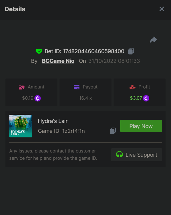 $2.5k Prestige Hilo Challenge #50 Starts: 10, October 6:00pm GMT Ends: 17, October 6:00pm GMT Hey Everybody! This week's prestige event is open to all VIP players and is giving away $2,500 in prizes. The Top 10 will win the major prize and the remaining $700 will be split between everyone else. And it doesn't stop there, any player who completes the extra bounty will receive an equal share of the $500 prize pool. Looking for a fun and challenging way to earn some extra BCD coins? Try your hand at Hilo. – (details further down). What's the Challenge? Win the highest multiplier you can on on BC.Game's in-house game, Hilo (Skipping is allowed). If there is a tie, the player with the higher average bet amount (in USD) shall be the winner. If there is a tie in the amount and payout, the one who posted or edited his post first will be considered in the Ranking. Minimum VIP There's no minimum VIP level Minimum Payouts Minimum payout to qualify is 30x Minimum Bet Size $0.15 USD equivalent Eligible Coins All cryptocurrencies are eligible (excepting JB) Available Prizes 1st Place....... $500 2nd Place..... $300 3rd Place...... $200 4th Place......$100 5th Place......$50 6th-10th.........$30 All other participants.........$700 Bounty Prize...$500, equal share. EXTRA BOUNTY Share a winning bet by exactly opening 3 cards KKK or AAA. The bet must be a winning bet. How to Enter To enter, copy the link of the bet you'd like to submit. Once you've copied it, paste it as a reply to this thread like so: Link: https://bc.game/#/sd/10UREKJY09HO9F In the same post, upload a screenshot of your win by clicking the game ID WITH VIEW IN USD mode ENABLED (accessible at the bottom of dropdown menu for your wallet up top. This way, we can ensure that your bet indeed met the minimum requirement at the time of placing it: Link: https://bc.game/#/sd/10UREKJY09HO9F Please combine all of your hits together in a SINGLE post. Edit your existing post for additional hits, don't create a new post. Each eligible entry must have the Bet Slip URL, failure to include it will disqualify participation in the event. Bet Slip image is not mandatory. Bets must be posted within 24 hours of placing bet in order to keep things fair for everyone. Bets must be made during the specified time window stated above. This thread will lock automatically when the time period is over. One (1) entry per household. Anyone found attempting to win multiple prizes will be disqualified from this challenge as well as all future challenges. Failure to follow instructions will result in your submission being null and void. By entering this challenge, you acknowledge that BC.Game has the final decision on results and placement. Payouts will be distributed after the event is finished. Please note that it could take anywhere between 24 hours to 7 days after the completion of the event. Good luck everyone!