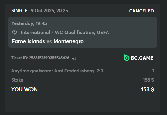 So I was watching this game and thought to place a bet on Arni Frederiksberg to score as it looked clear that more goals were going to be scored in the game. As you can see, i placed the bet when it was 2-0 and he scored the 4th goal. I open bc game to collect my winnings and to my surprise the bet for some reason has been cancelled and voided. I have now been on livechat for 5 days trying to get this resolved, yet they are saying the same issue they are 'looking at it' 'working urgently', yet they then said today i had to create a new ticket as it got messed up. They clearly are trying to get out of paying me and I am doing this to spread awareness, or maybe the team can rectify this mistake and settle the bet correctly. The livechat agent assured me to check in after 24 hours and it would be sorted yet nothing. Please help me out as this money is very much needed, especially after the crypto crash on Friday.