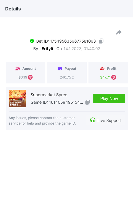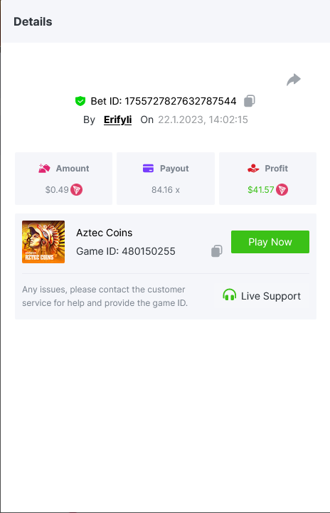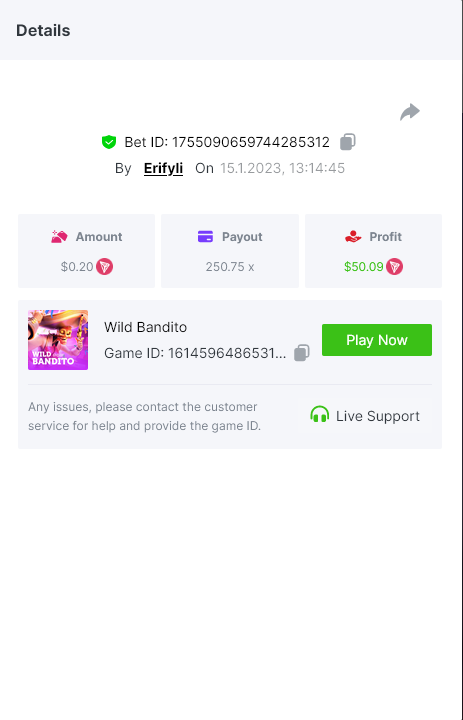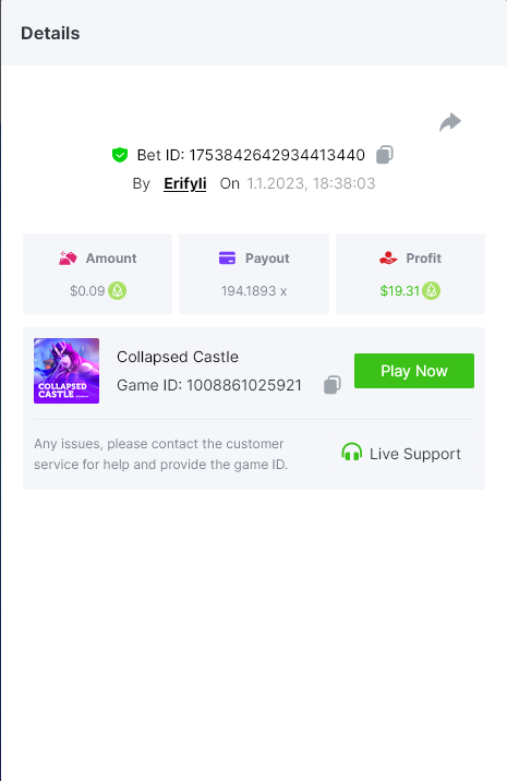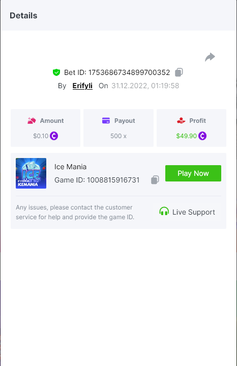 6. Bounty ? https://bc.game/#/sd/1123A7FXI98S9F The exact amount paid in the game was 50x but the multi shown is 0.05 higher than in reality. Not sure if this counts as bounty. https://bc.game/#/sd/1123L1X3SF7YTV https://bc.game/#/sd/111XF58ISYZR4J https://bc.game/#/sd/111X8MPZ776SYB https://bc.game/#/sd/111XAGX5V8YMMR https://bc.game/#/sd/1121WOEHI0AT5F https://bc.game/#/sd/111XKLL6U67THV