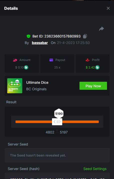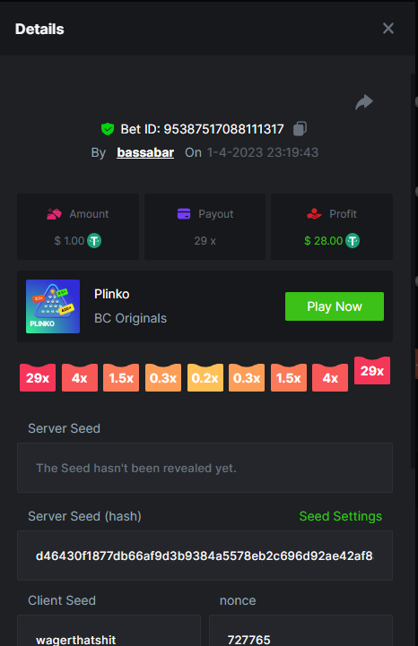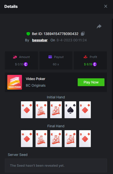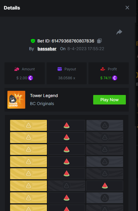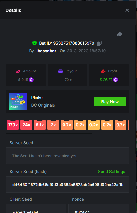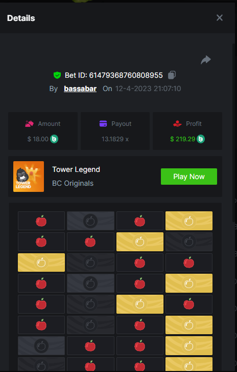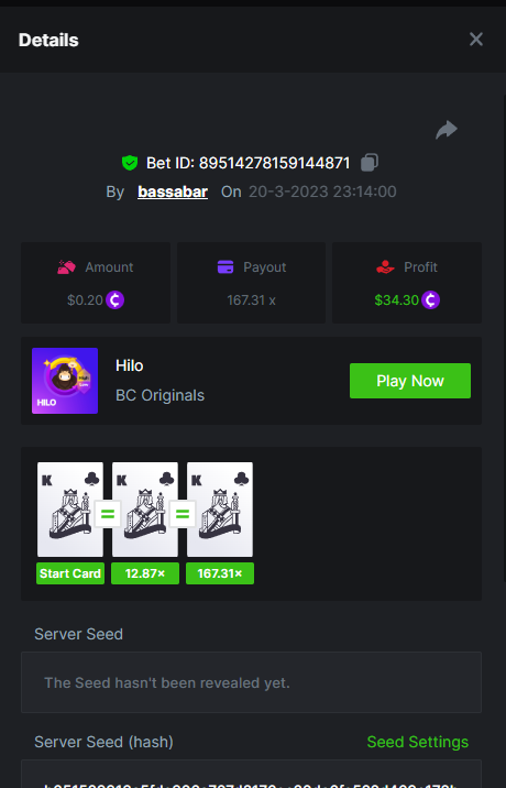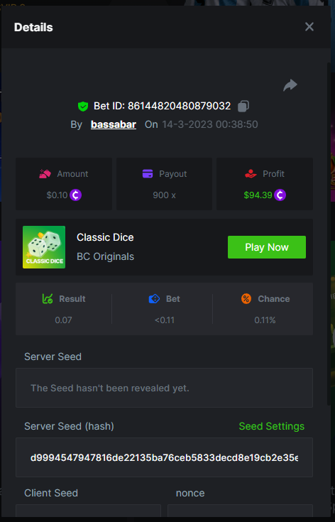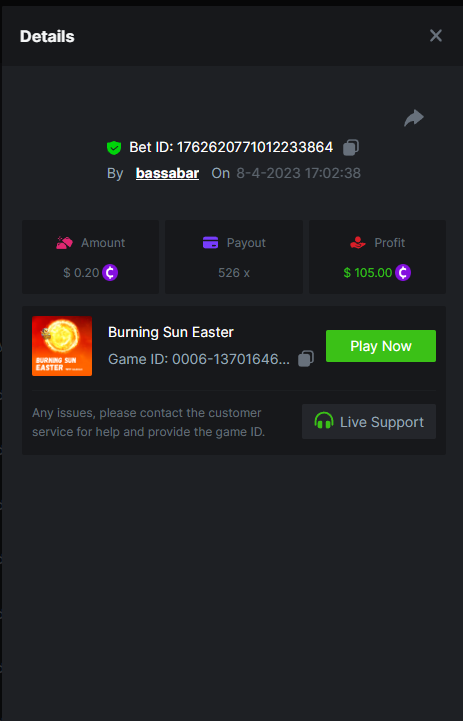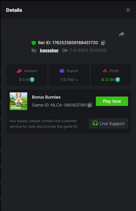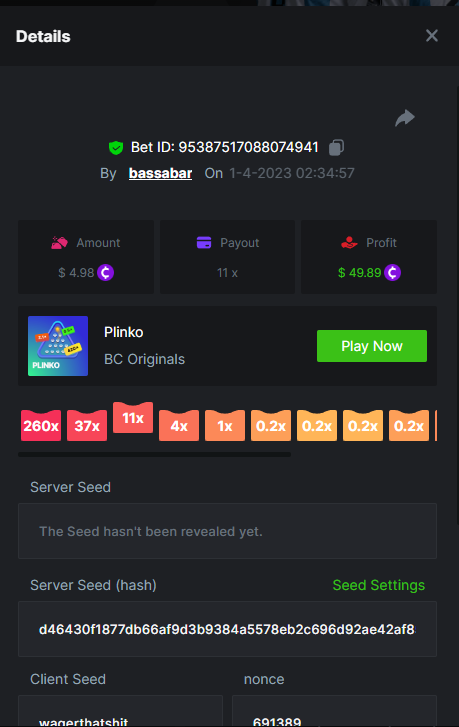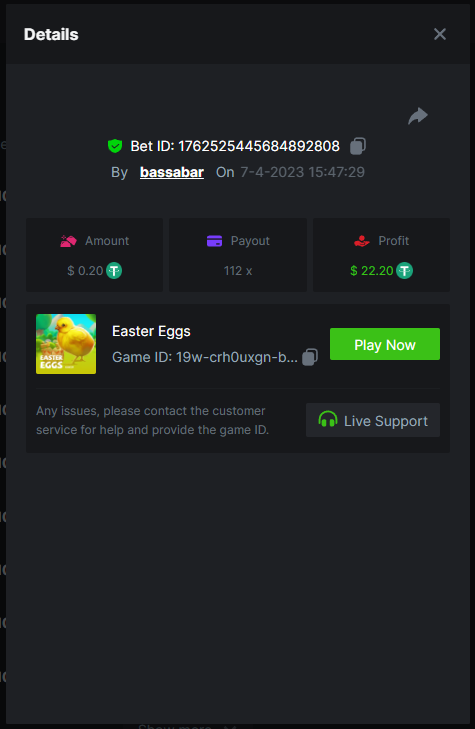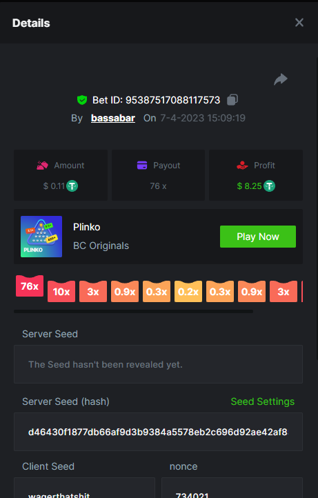 19. So it's just who place the highest bet on a single 12x win? Not consecutive wins or something? 12x https://bc.game/#/sd/114VKR7ICKMGPF Bounty (Tie, all red) https://bc.game/#/sd/114LUSQGPLD9G3