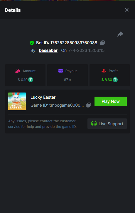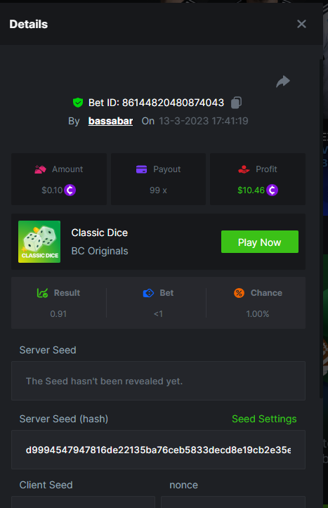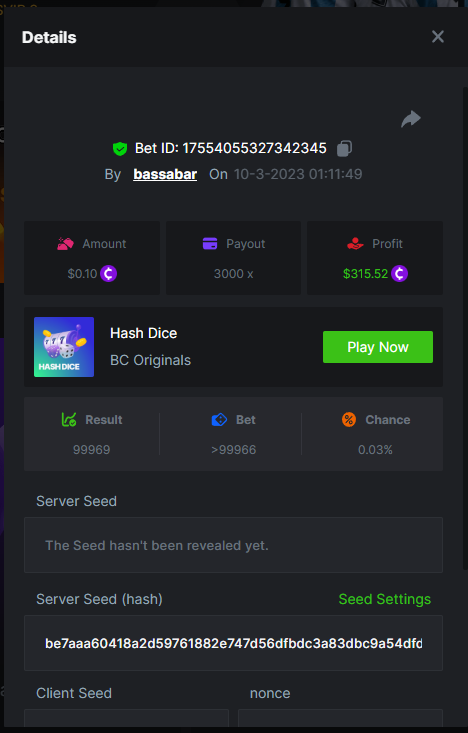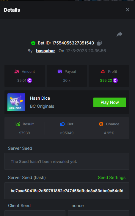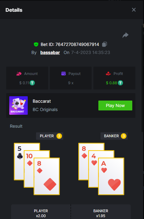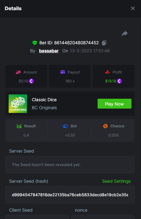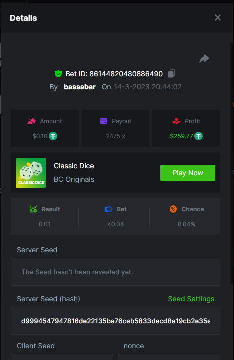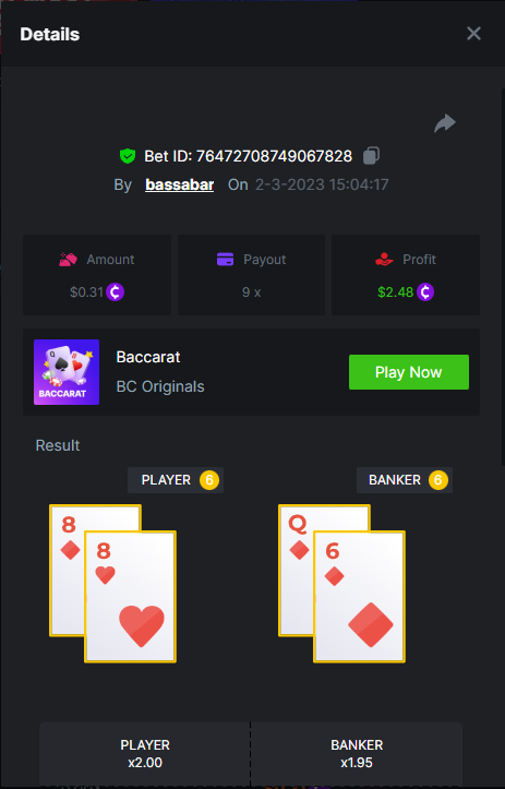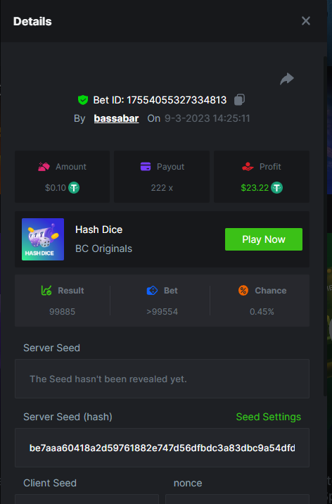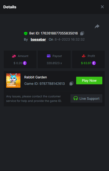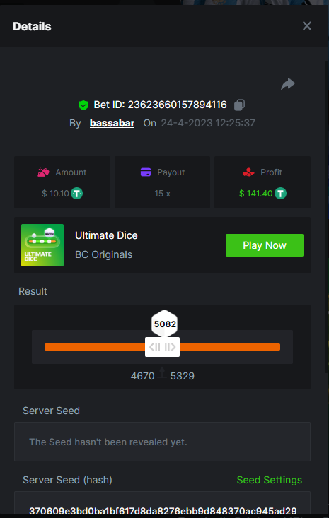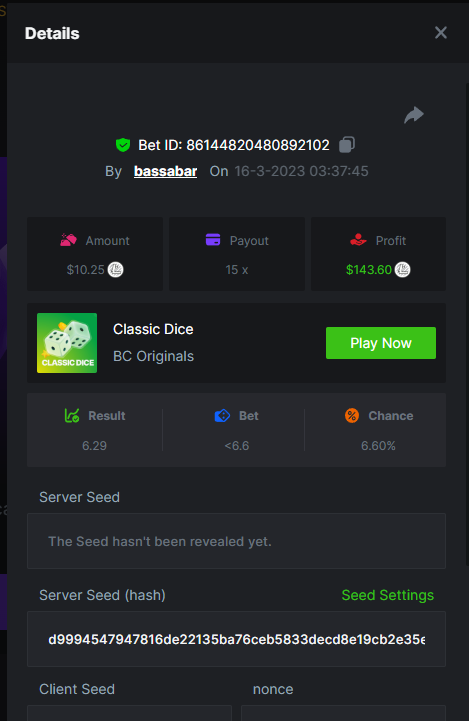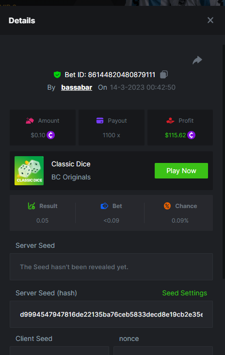 19. So it's just who place the highest bet on a single 12x win? Not consecutive wins or something? 12x https://bc.game/#/sd/114VKR7ICKMGPF Bounty (Tie, all red) https://bc.game/#/sd/114LUSQGPLD9G3