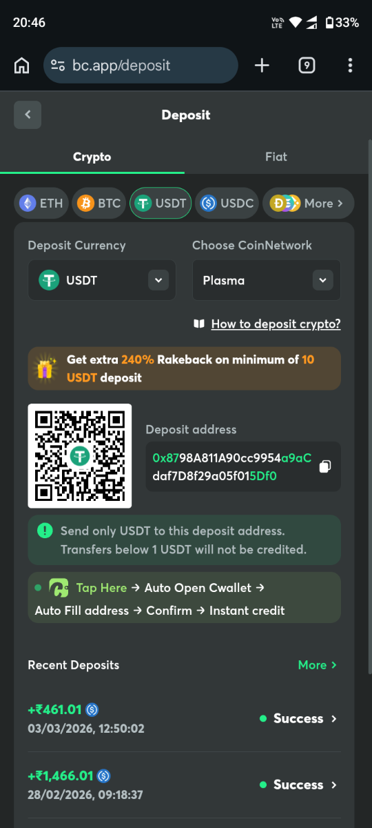 1. Hi Team, I had deposited USDT on Plasma network in bc.game but it was not credited. Time: 2026-03-09 20:23:59 Receiving: 55.233757 USDT Network fee: 0.1 USDT Network: Plasma (USDTO) Withdrawal address: 0x8798A811A90cc9954a9aCdaf7D8f29a05f015Df0 TXID: 0xa64f23d0b8544cb77a88211d2904c43457e5129c660f701d88582a97926f4c70 Plasma network - https://plasmascan.to/tx/0xa64f23d0b8544cb77a88211d2904c43457e5129c660f701d88582a97926f4c70 I have contacted the bc.game live support but they keep asking for order id but it was not generated. I request the team to please look into the issue, the attached screenshot and plasma network and credit the USDT to my account. My userid is 1046452 Warrior777 Regards