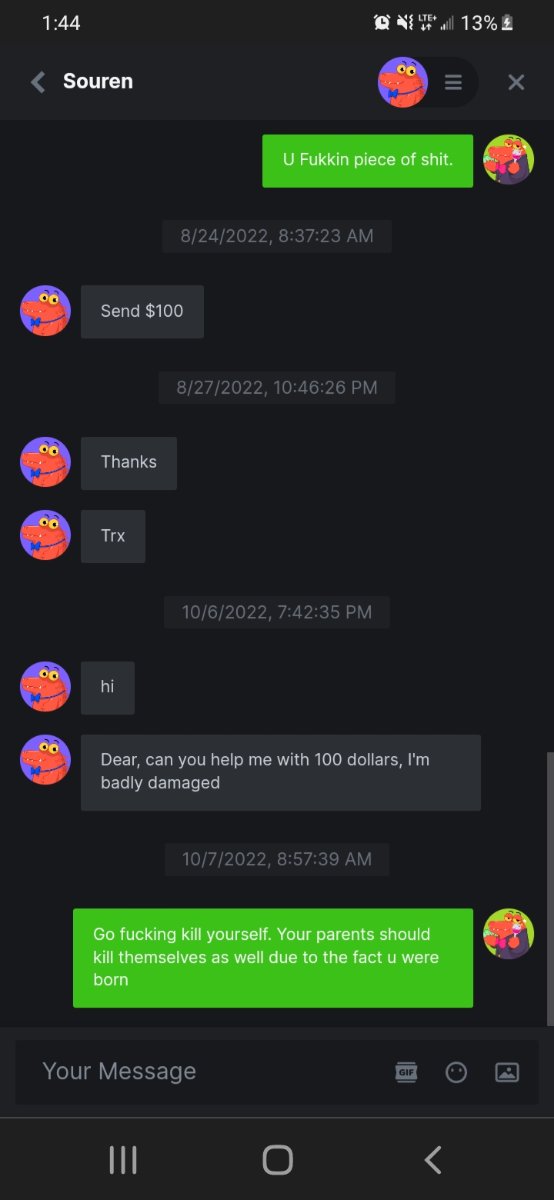 Here's a couple screenshots of a recent beggar for example. Was I to hard on this bottom feeding piece of trash u think? 🙄😅🤣