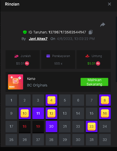 Maksypro Posted April 6, 2023 Share Posted April 6, 2023 (edited) Read Carefully Before Start To Hunt Daily Challenges #197 KENO Hunt : Win the highest multiplier Min Multiplier requirement 100x Min Level 4 ️Duration Starting : Now End time : 23.59 UTC Time How to Join? Make screenshot + paste your bet link + UID or Profile link Any coin, with min bet 0.01 USD is allowed (jb/bb/bcl not allowed) Reward Prizes 1st Place.....$7 BCD 2nd Place.....$5 BCD 3rd Place.....$4 BCD 4th Place.....$3 BCD 5th Place.....$2 BCD 🏵 Winners will be announcing next day after Roll Point! Edited April 6, 2023 by Maksypro Link to comment Share on other sites More sharing options...