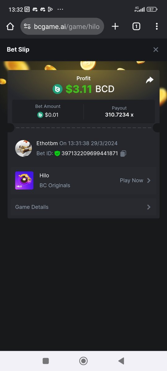 JKDeux Posted March 29, 2024 Share Posted March 29, 2024 (edited) 3 hours ago, Kikikom said: Read Carefully Before Start To Hunt Forum Daily Challenges #554Hunt : HiLo Win the highest pay out Min Payout : 20x Min Level 10 ️Duration Starting : Now End time : 23.59 UTC Time How to Join? Make screenshot + paste your bet link + UID or Profile link Any coin, with min bet 0.01 USD is allowed (jb/bb/bcl not allowed) Reward Prizes 1st Place.....$7 BCD 2nd Place.....$5 BCD 3rd Place.....$4 BCD 4th Place.....$3 BCD 5th Place.....$2 BCD 🏵 Winners will be announcing next day after Roll Point! https://bc.game/#/sd/11VMRZ40YNCKW7 ID : 11085373 Edited March 29, 2024 by SoS Link to comment Share on other sites More sharing options...