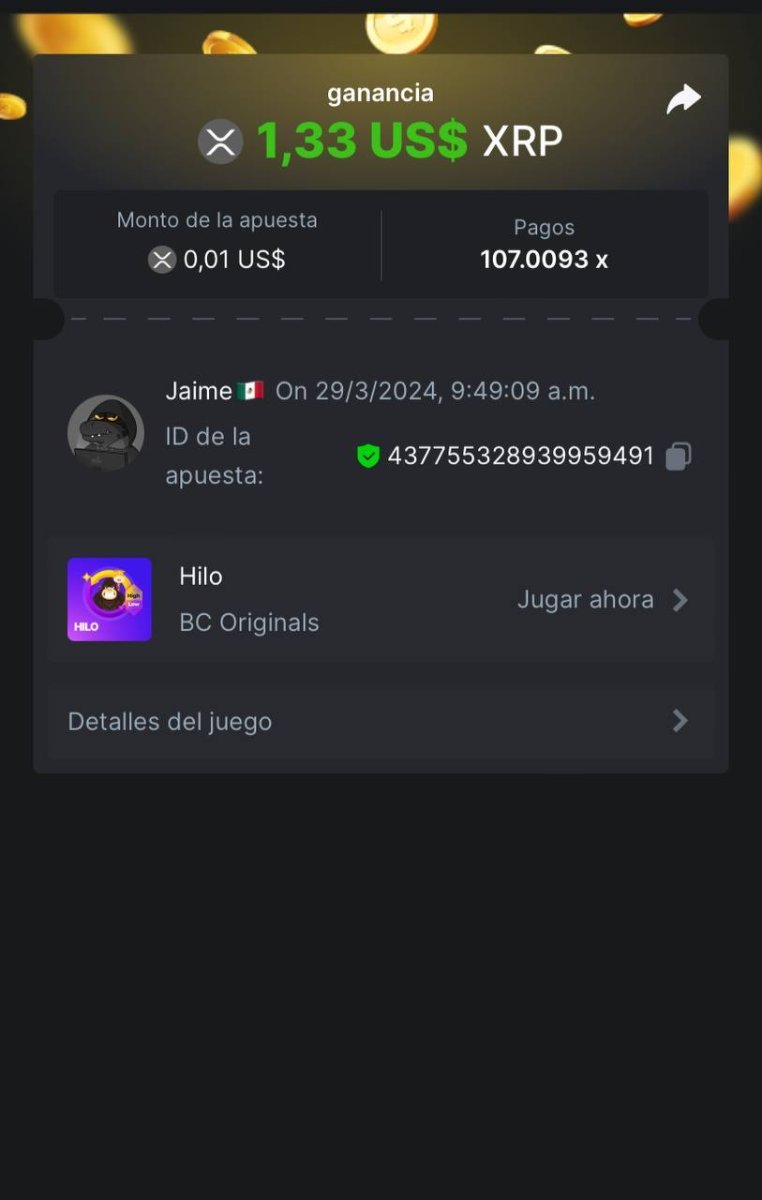 Rbpnxblqjpac Posted March 29, 2024 Share Posted March 29, 2024 23 minutes ago, Kikikom said: Read Carefully Before Start To Hunt Forum Daily Challenges #554Hunt : HiLo Win the highest pay out Min Payout : 20x Min Level 10 ️Duration Starting : Now End time : 23.59 UTC Time How to Join? Make screenshot + paste your bet link + UID or Profile link Any coin, with min bet 0.01 USD is allowed (jb/bb/bcl not allowed) Reward Prizes 1st Place.....$7 BCD 2nd Place.....$5 BCD 3rd Place.....$4 BCD 4th Place.....$3 BCD 5th Place.....$2 BCD 🏵 Winners will be announcing next day after Roll Point! Link to comment Share on other sites More sharing options...