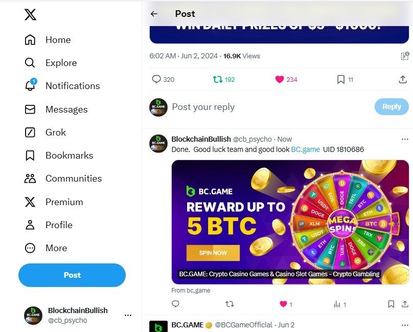 Xpptemkyproac Posted June 4, 2024 Share Posted June 4, 2024 ย x account: @bighit1000 (https://x.com/bighit1000) Bcgame UID:ย 3125752 (https://bc.game/#/user/profile/3125752) ย Link to comment Share on other sites More sharing options...