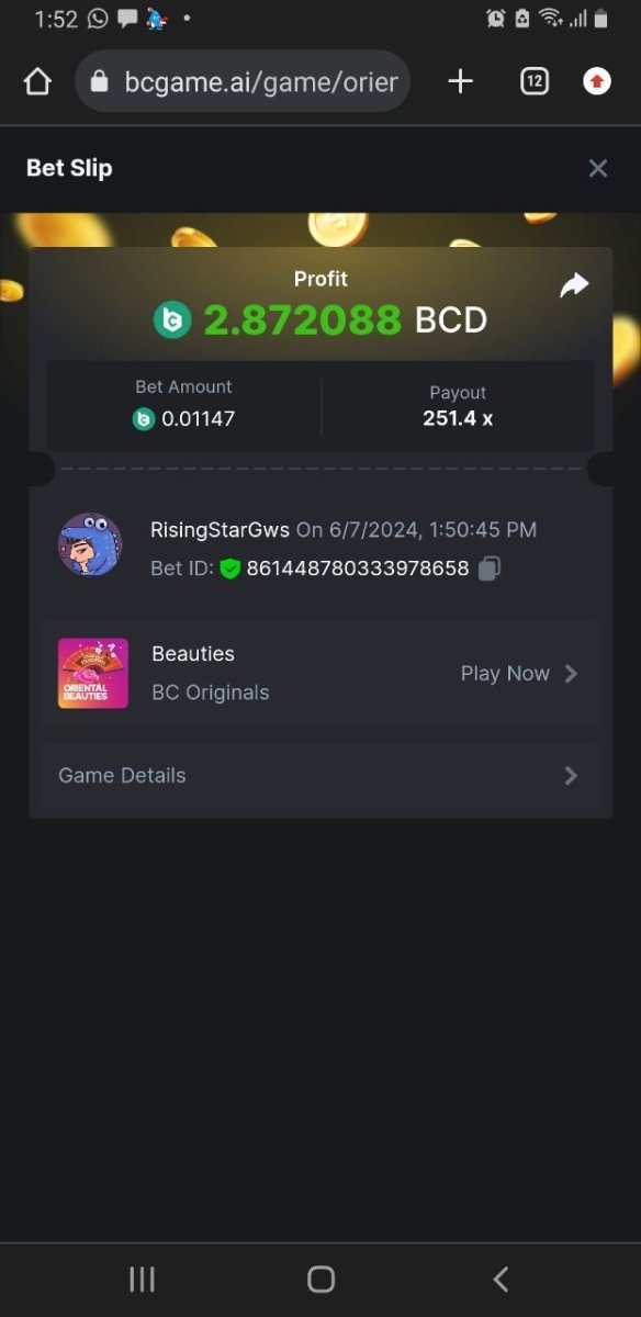 Moderator Giandreas Posted June 8, 2024 Author Moderator Share Posted June 8, 2024 List of winner daily Forum challenges #624 1st place…….. Win 7 bcd - Notsam_su - 359,4 x - 5,25$ 2nd place……..Win 5 bcd - RisingStarGws - 254,4 x - 2,87$ 3rd place…….. Win 4 bcd - Kristalina - 107,8 x - 1,3$ 4th place……..Win 3 bcd - Mired - 88,8 x - 1,4$ 5th place……..Win 2 bcd - Rakorbakc - 80,8 x - 1,27$ Please,don't forget UID for your post How to claim your reward : These steps help us faster to verify. Step by step how to claim : DM/PM Me (forum) and Telegram @Kikikom_bcgame And wait for accepting.( If you accepted and didn't answer for 5 min you will be removed and have to join again) Share the screenshot Share the win bet link (daily challenges) Share UID or Profile linkWait for a response Link to comment Share on other sites More sharing options...