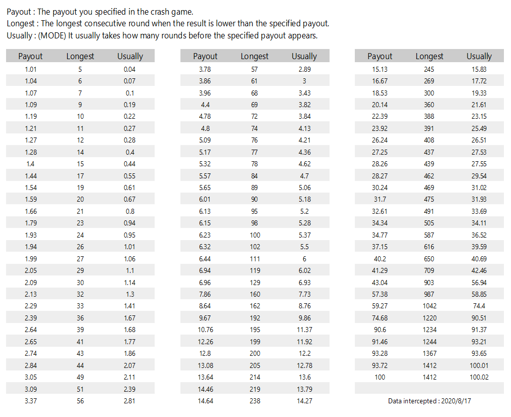 Example: If you are looking for the longest round of payout 2.0, its longest round should be 27. And it usually appears after 1.06 rounds.