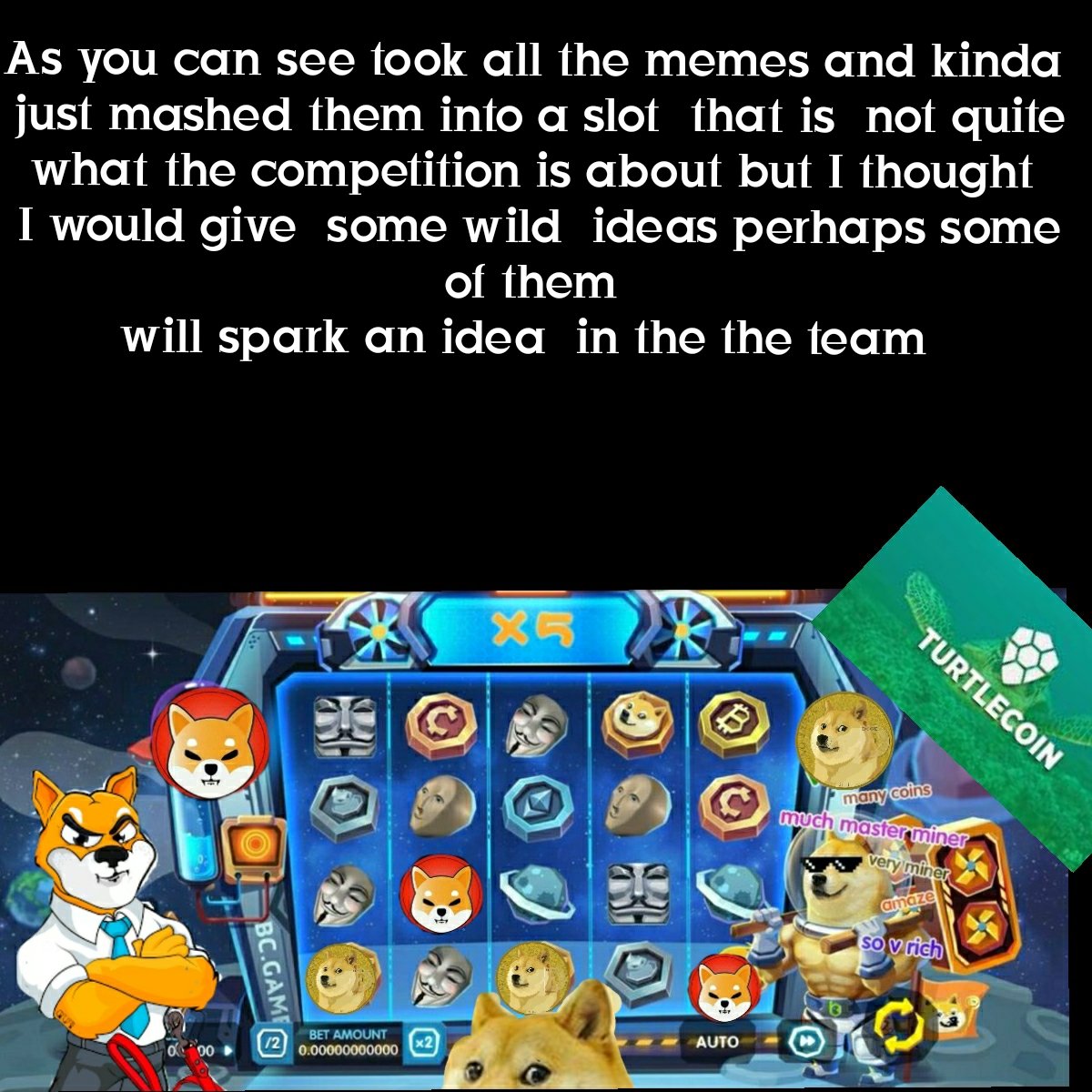 Donovan_Snow Posted May 16, 2021 Share Posted May 16, 2021 Bad week FOR THE CRYPTO COMMUNITY HOPE THIS SCREAMING DOG MAKES EVERYONES DAY A BIT BRIGHTER. Here is a happy dog hang in their puppy. I kept changing the stories based on how the markets and meme coins in general were performing but its futile so just going to submit thes regardless ☆ Happy dog ☆ Took Longer then I thought 4 days on the meme joke one and 5 on the real design but been a bit hectic in the doggy world I Apolgize for using some of the teams sketch designs in the first slot I created and for not first asking for the consent to use the intellectual property of the team members I say this because I kinda went over board with the first submition was unsure ff it was acceptable to Dm. " Would have posted sooner but it was more difficult then I thought. THE Whole battle of the memes vibe going around is compelling ( But since the $1 billion in Shiba 50% of the overall supply was donated. And mister E-M that needs to stop tweeting can' t know for sure if this Meme high will last I truly hope so because i have so many fun ideas for the war of memes. ♡ The super duper uber slot ♡ 1. A Detailed layout and design draft 2. Bonuses and special features 3. Inter spacial rocket add 4 .Symbol list 5. Paylines and Pay Table 7. Video link to the intro video's 8. Way to much puns used memes9. Reel & Slot designs Bonus designs12. MISCELLANEOUS A special event This one is a bit weird I went off book and used some other images hope it is okey this is anyways just like a gift for the zoo coiners and I am also one of them lol. took 2 days to do a bit longer then i was intending to spent on the joke part of the slot but i had some time to make the real slot suggestion it will be added second first the meme slot. 1. DOGE WARS 1. DOGE was a happy puppy beloved by all we hoarded him and we shared him we gave him away without a second thought then a bored man thought let me take this token that is a part of the crypto community and bring it to live. And that he did well wit was great for a few but some saw how much they had and never kept. Sad days for us. Then came a shiba well their both actually shiba inu breeds but no matter shiba wanted to be the next million dollar brand so they gave him the name the doge killer a and this is how the battle of the memes began Doge is so popular must be tiresomen being Hounded by the Pup-arazzi non stop, I am going to Shed some light on the matter. I might be barking up the wrong tree Here but hope the price wont go cold like a pup-sicle. Great Dane I have some tall Tails this Shiba & Shiba thing is going to Tick some people of Doge has been going through a Rough pouch lately. I Digged up some clues about why turns out its Shiba think we might need a ruffuree . Shiba wants to leash doge and go to the moon first or is that a bit Far fetched you know what they say everything is paw-sible shiba might be the new Hot Dog. Is it the Bark side of the moon for Doge Seems shiba is a bit Husky on the hype but doge wont roll over and take it This Battle of the memes will be Furr-roucious. A storm's cumming hope I dont step in a Poodle. Doge is the real Big Dog iit really Beagles my mind how shiba is " the Doge killer so get your Pup-corn and ,prepare to raise the roof. And call a shrink because nobody deserves to go through so many puns tortuous. I added this part before the crash left it in because I actually dont know why just feels right. Also I made the video before the crash again apologies . Apologies. 1. 1st pay table scheme. The Rules are as follows 16 Pay lines 2 bonus events 2.1 ☆ The Underdog ☆ The feature is triggerd by getting the 1st, 2nd and 3rd rows covered by $Shib . The feature is played as described below The player will choose a titles each time revealing a multiplier or the bust symbol the feature ends when all rewards are revealed or when the player chose a bust symbol. Will be the same as cave and hi lo the player decides when to cashout or if they want to risk it and lose it. If the player reached the end without choosing a bust symbol a being take the winnings ending the feature and fetch which give the player the opportunity to get One of these 3 rewards X50 X75 X 100 this will increase their total bonus winnings by X they recieved however It is risky because their will be 50 Tiles to choose from but only 3 has a multiplier reward the other 47 have a lost symbol if the player receives the symbol then the entire bonus amount that was won will be terminated and no payout given this option is optional not mandatory. Note the amounts refrenced are just an example of payouts potential ammounts) . ☆ 2 World War Memes ☆ This will seem a bit complex at the beginning but it's quiet simple there are 4 characters to choose from when the frees spins are triggerd 1.Turtle 2.Bannano 3 Doge 4.$Shiba is a free spins feature that is triggerd by getting a Doge dog in the 1st a turtle in the second row a monkey int the third row and a $Shiba in the fourth row. The player will choose between one of the 4 memes And the war begins the after the player chooses his meme the 5 free spins will initiate dependong on which meme you chose their will be a gauge at the side of the slot, each time a meme of your chosen meme appears the gauge will fill up once it has filled 5 aditional spins will be awarded and also a new meme will join with his own gauge and like before each time a meme token appears on the screen the gaugebfills up this will continue until spins are finished or until all four memes have appeared onnscreennwith their gauges also filled then s micro event will trigger jwere the 4 memes are on a space launch pad trying to be the first to reach the rocket and goto tlhe moon its random but if it is the meme you chose at the start of the free spins the moon and beyond the I thought about adding a feature that after each spin the meme dogs move across the lines and the Doge coin dog has two token